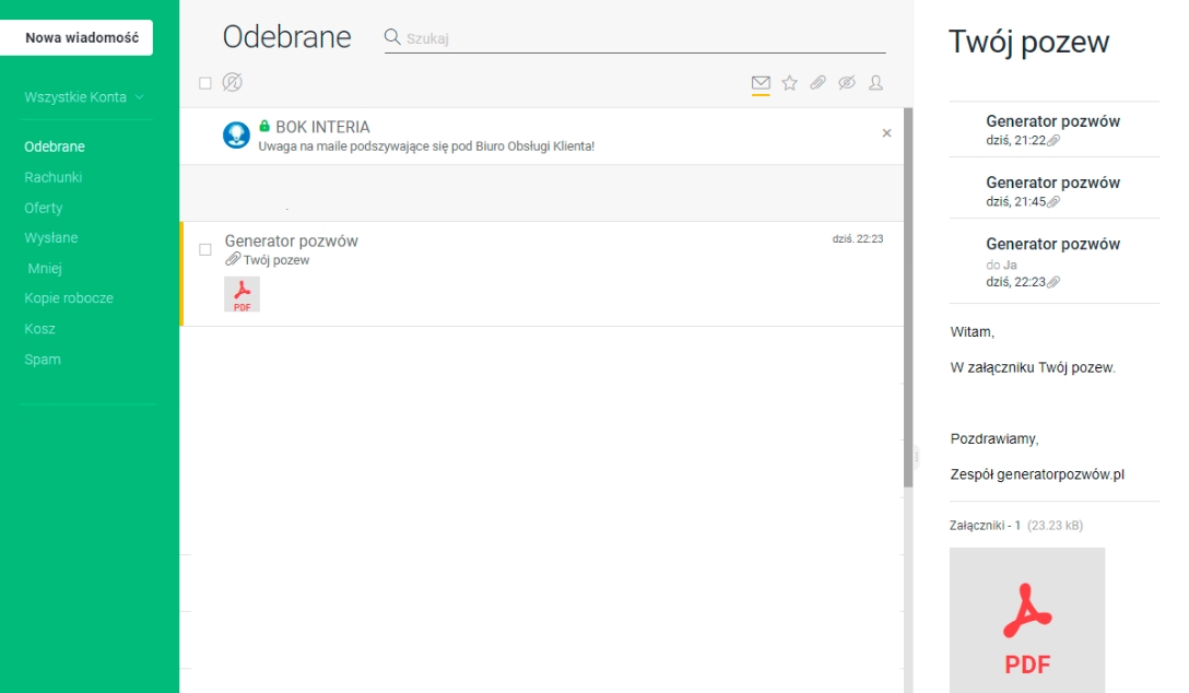 Czasami zdarza się, że email z pozwem trafia do folderu SPAM, dlatego zalecamy sprawdzenie tegoż folderu.